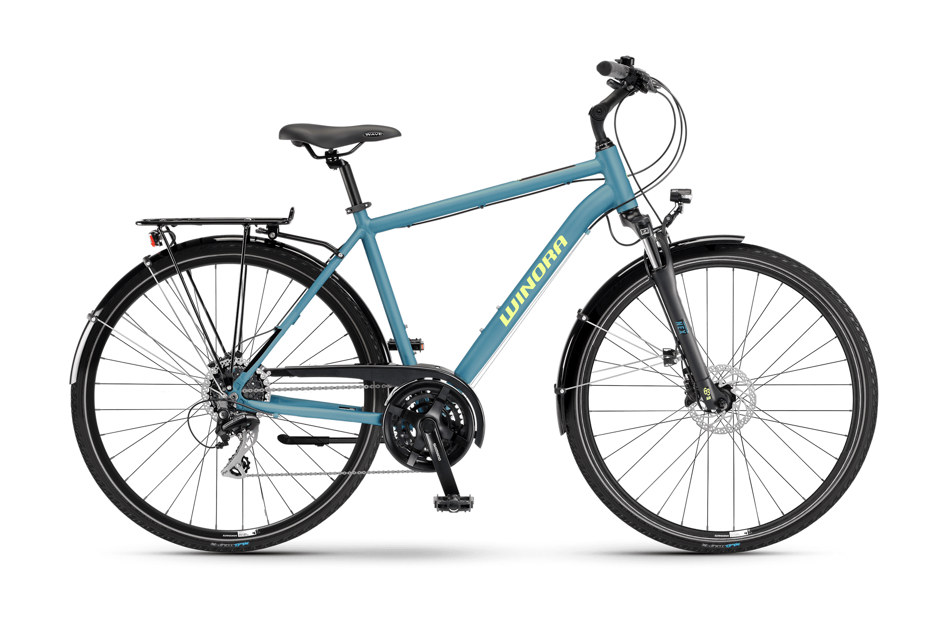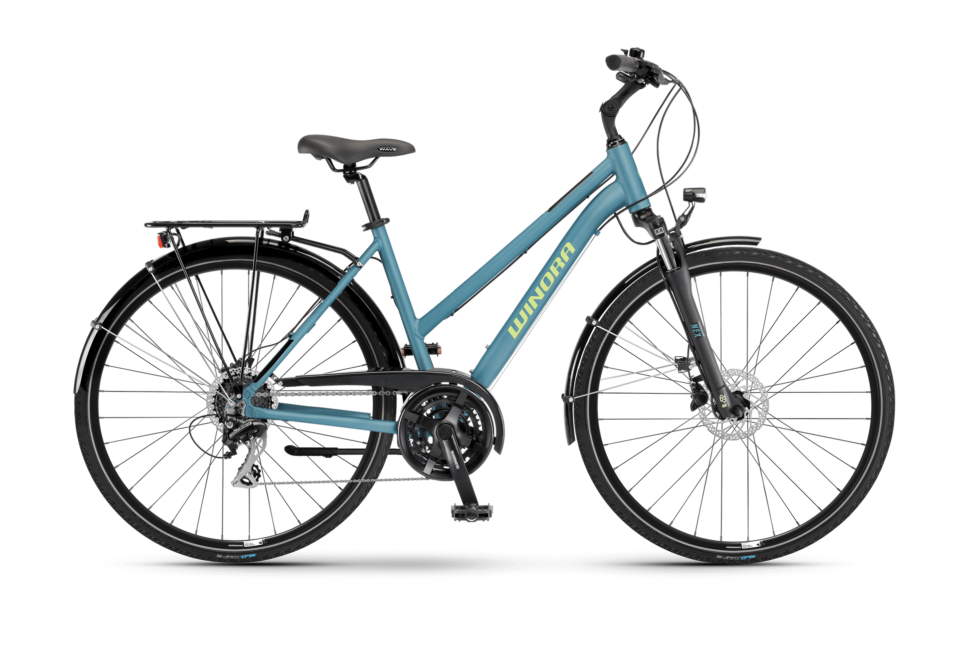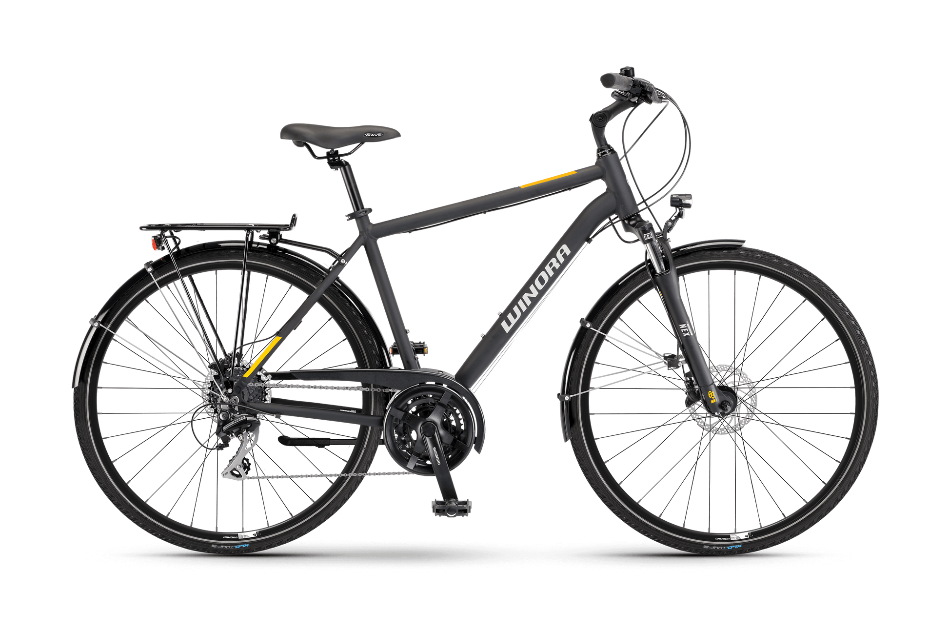 Get on and ride to the horizon and beyond! Our Winora Domingo 24 is a dynamic and versatile trekking bike that is ready for any tour. With the lightweight, -quality aluminium frame and a suspension fork by SR Suntour with 63mm travel, you will roll comfortably over asphalt and gravel. When the going gets steeper, you'll always find the perfect gear ratio with the smooth Shimano shifting system with 24 gears. You don't have to worry about going downhill either, thanks to the powerful disc brakes. Practical: on longer rides, the standard luggage rack will carry everything you need. In the dark, the reflective paintwork ensures more safety. In short: a trekking bike that will take you to the horizon – and maybe even a little further.