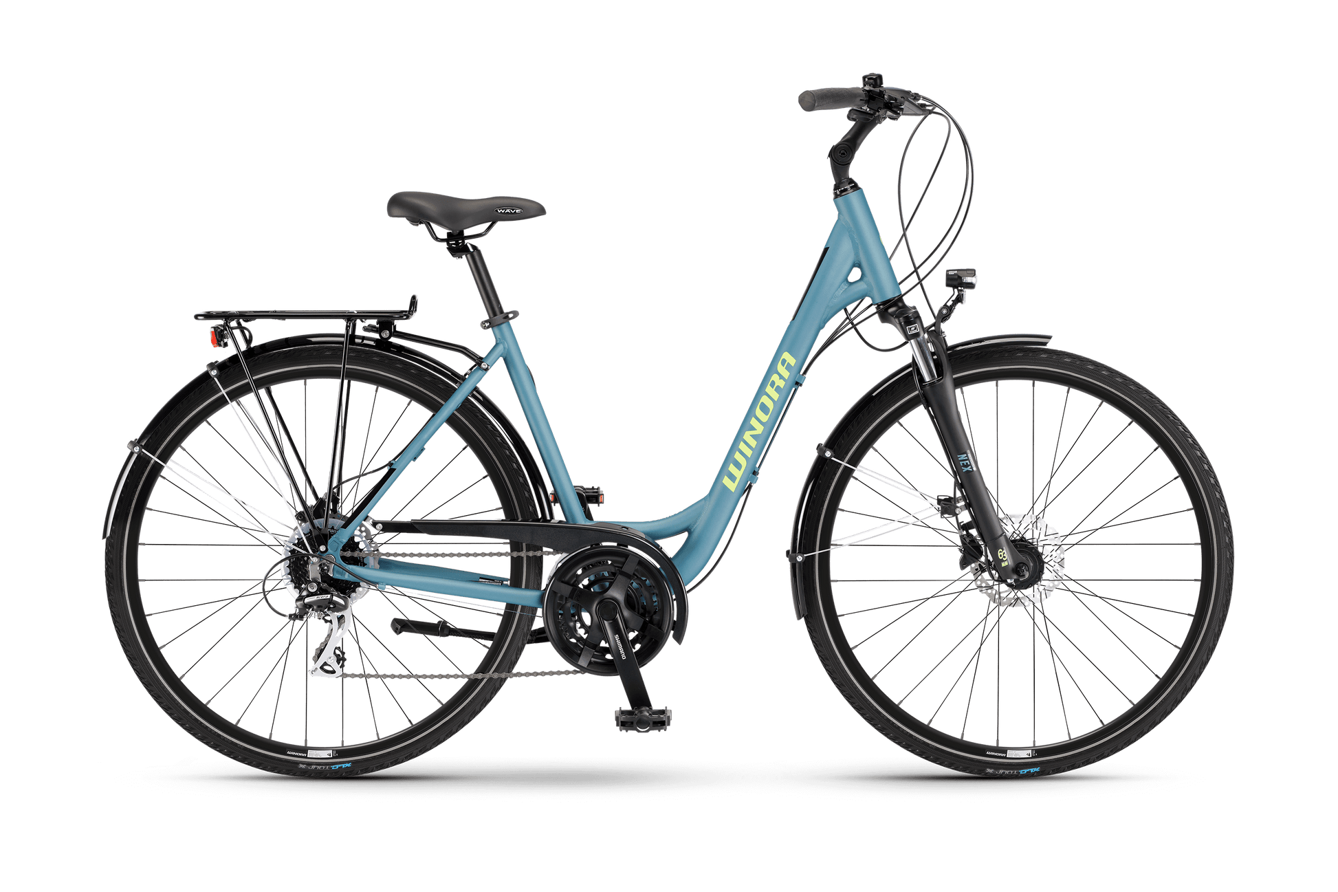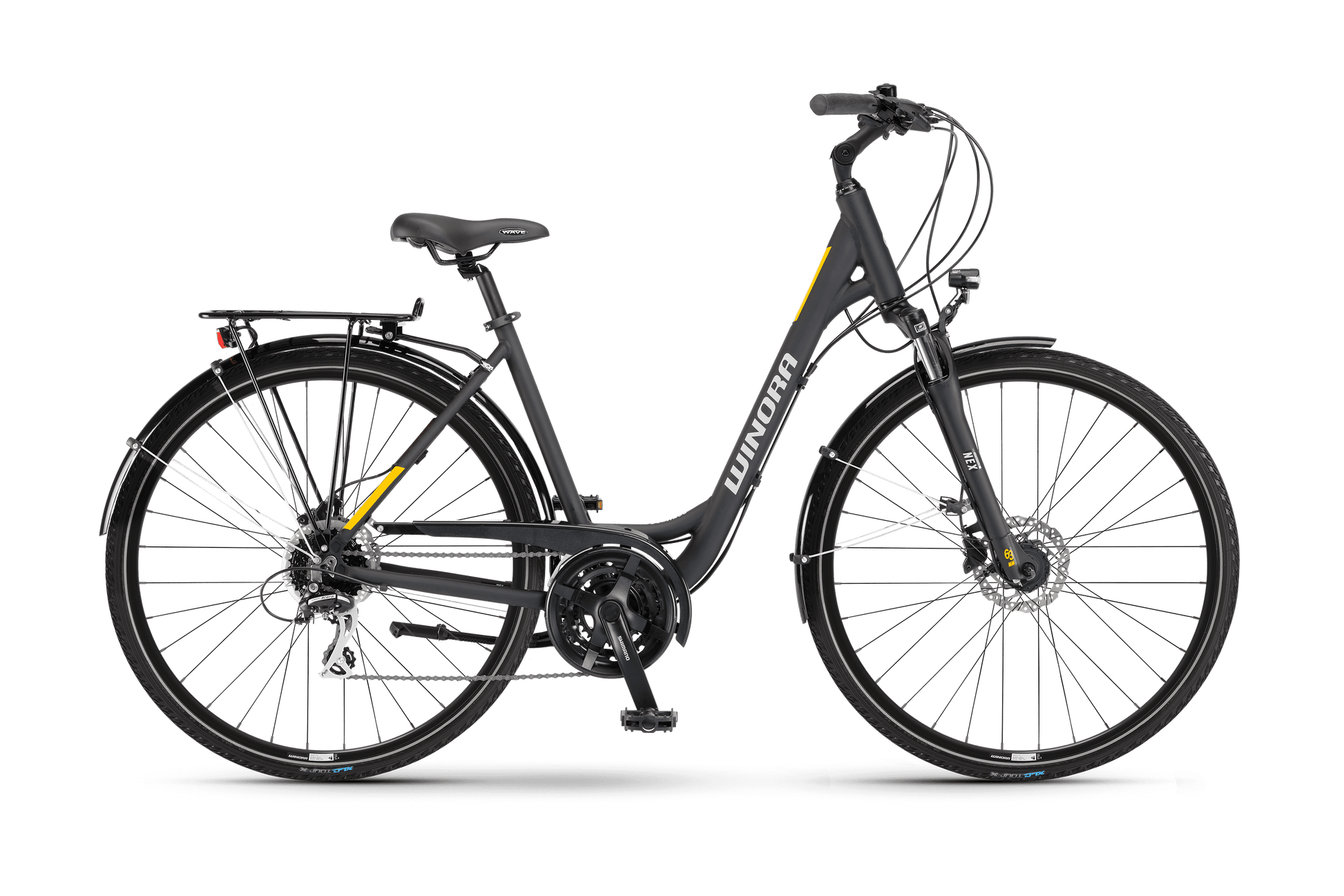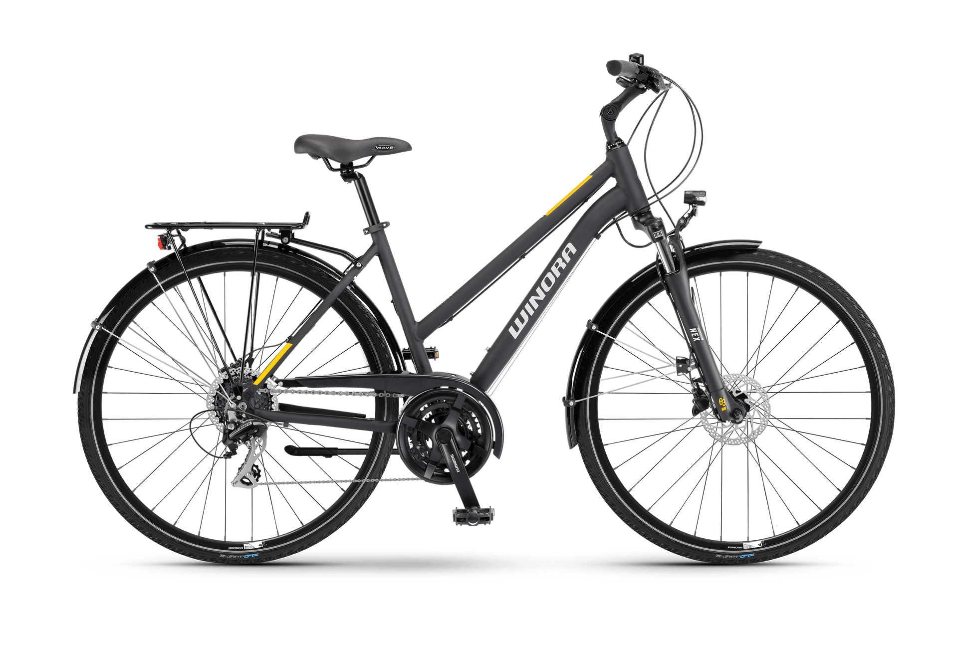 Get on and ride to the horizon and beyond! Our Winora Domingo 24 is a dynamic and versatile trekking bike that is ready for any tour. With the lightweight, -quality aluminium frame and a suspension fork by SR Suntour with 63mm travel, you will roll comfortably over asphalt and gravel. When the going gets steeper, you'll always find the perfect gear ratio with the smooth Shimano shifting system with 24 gears. You don't have to worry about going downhill either, thanks to the powerful disc brakes. Practical: on longer rides, the standard luggage rack will carry everything you need. In the dark, the reflective paintwork ensures more safety. In short: a trekking bike that will take you to the horizon – and maybe even a little further.